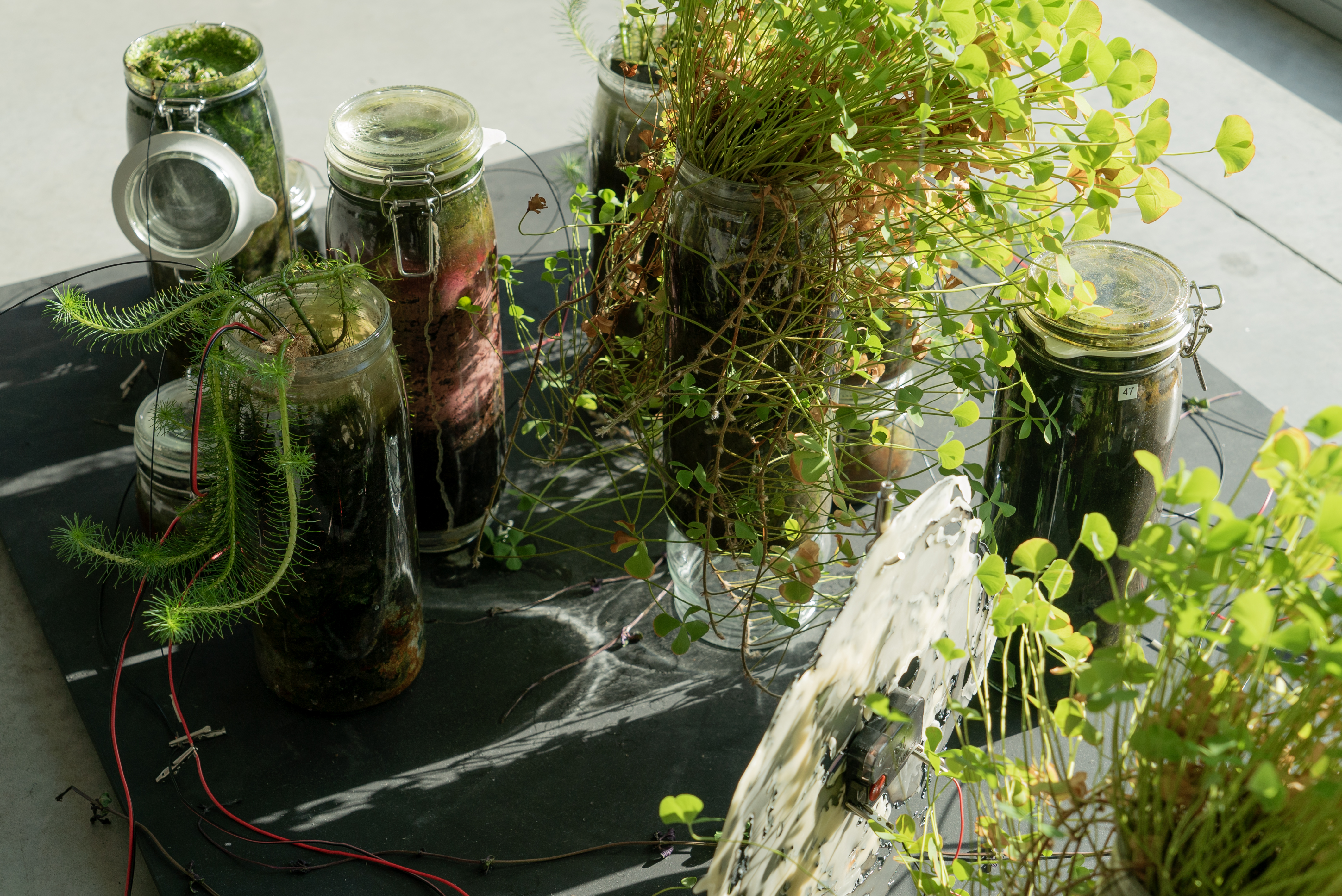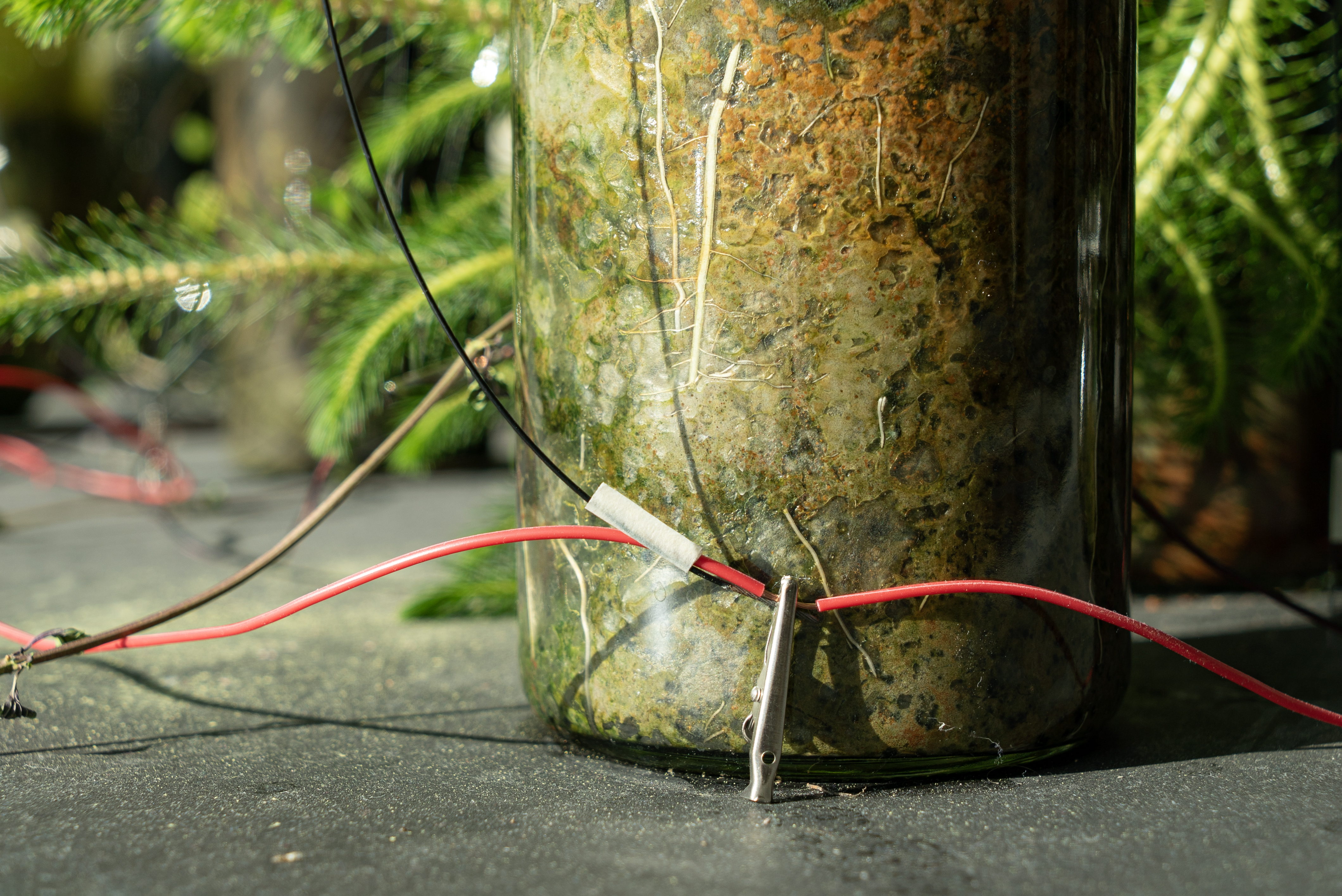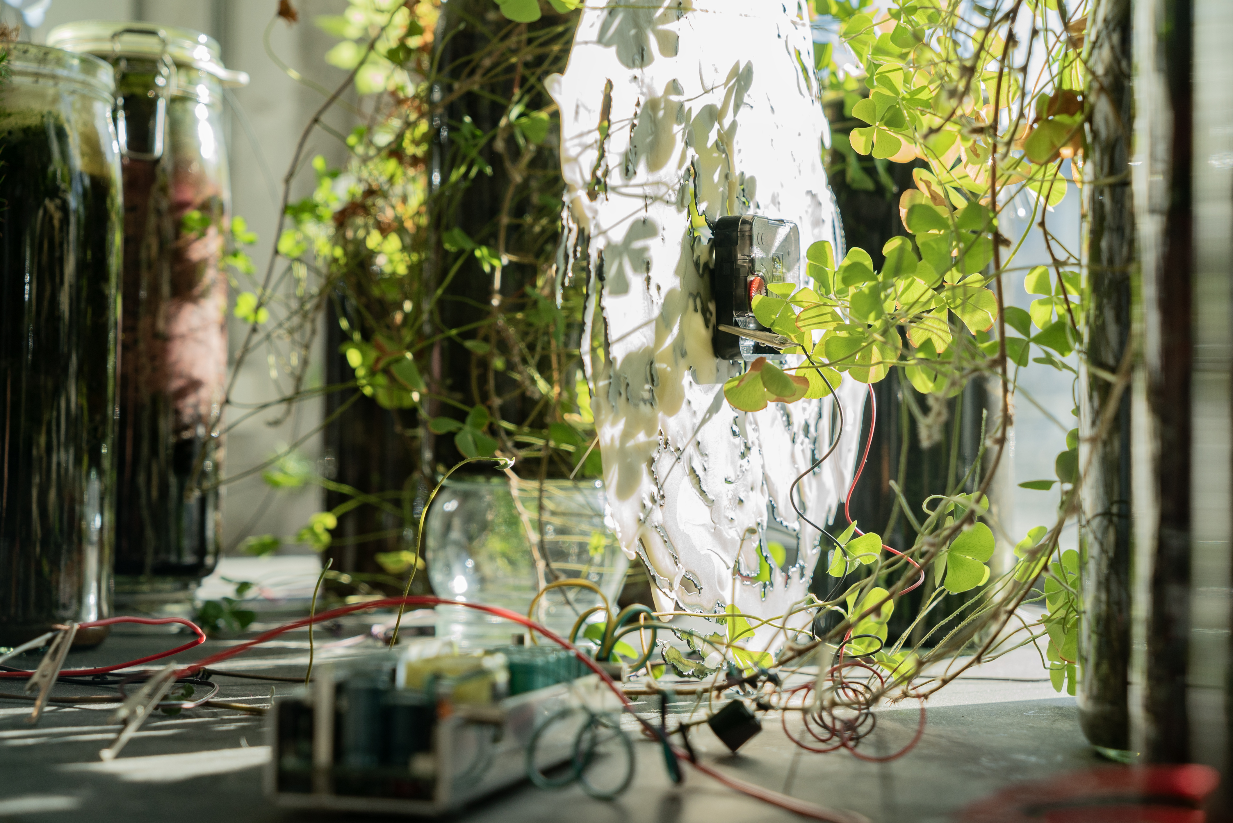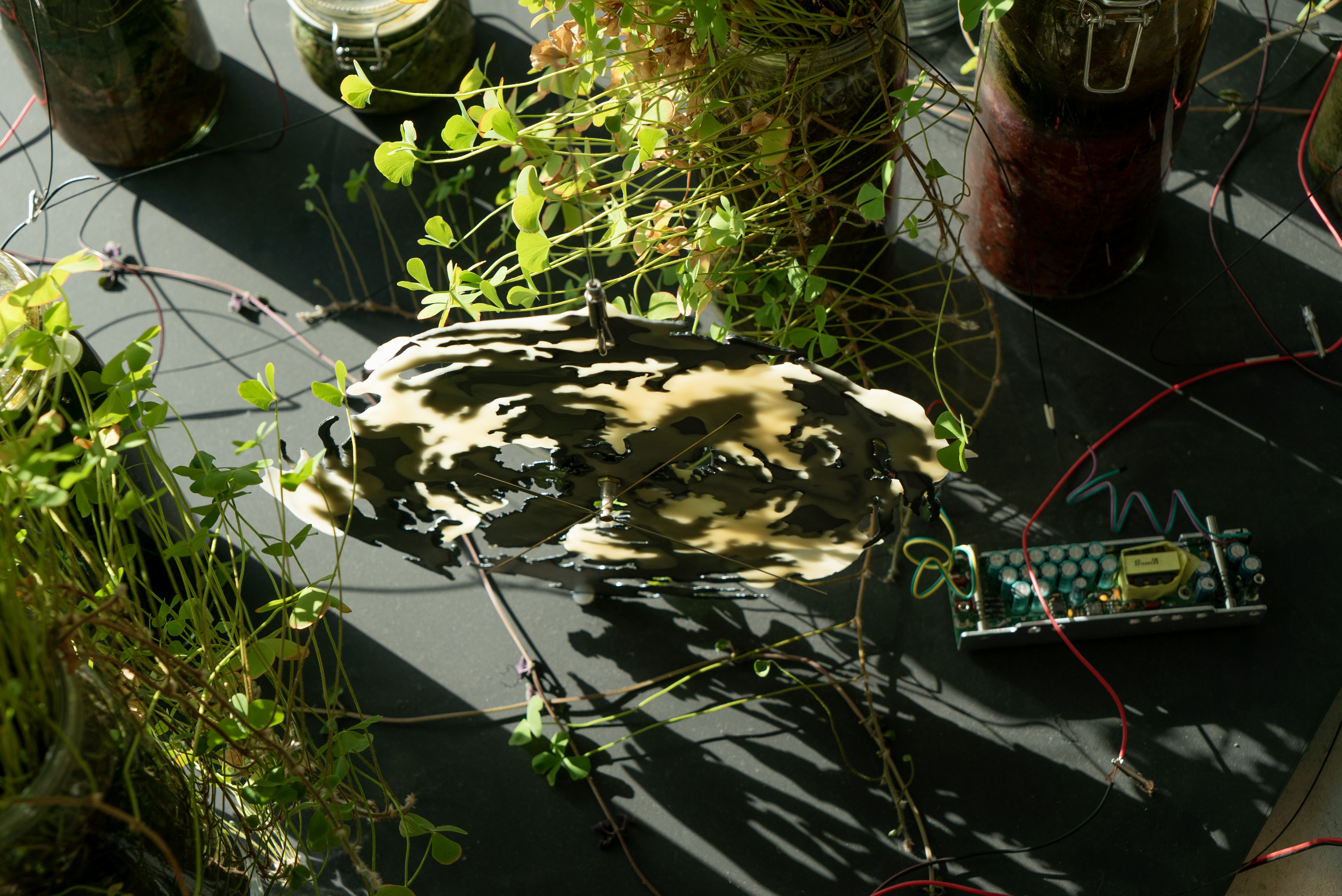 The artist investigates networks where the rhythms of human and non-human entities intertwine, focusing on the concepts of temporality, conductivity, decay, and care. She reinterprets conventional technologies, often viewed as energy consumers, as entities requiring care. By incorporating the environmentally sensitive characteristics of bacteria—reacting to changes in weather, temperature, humidity, and soil nutrients—into the energy generation process, the work embraces natural uncertainties instead of technological perfection, exploring the potential of cyclical electronic systems.