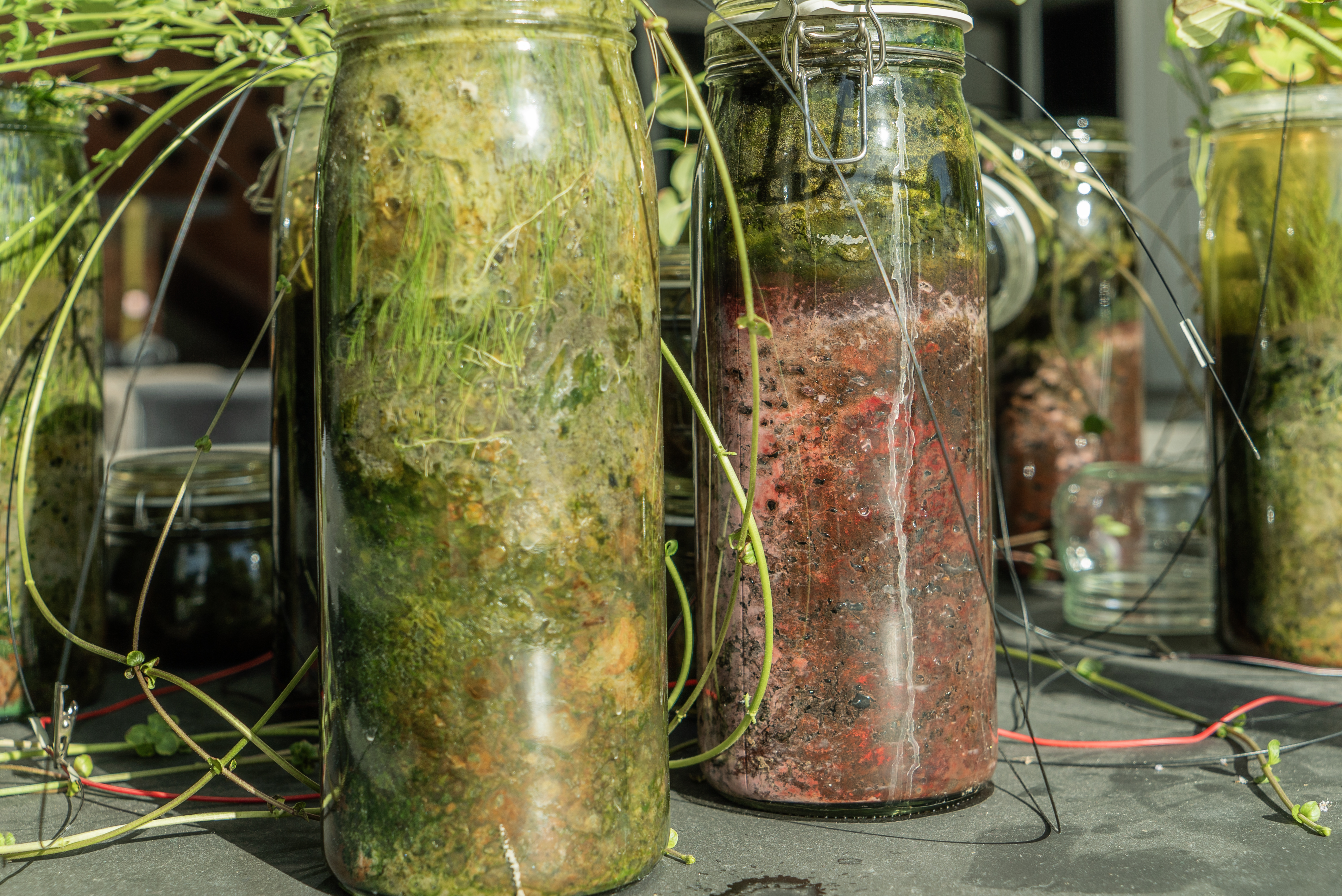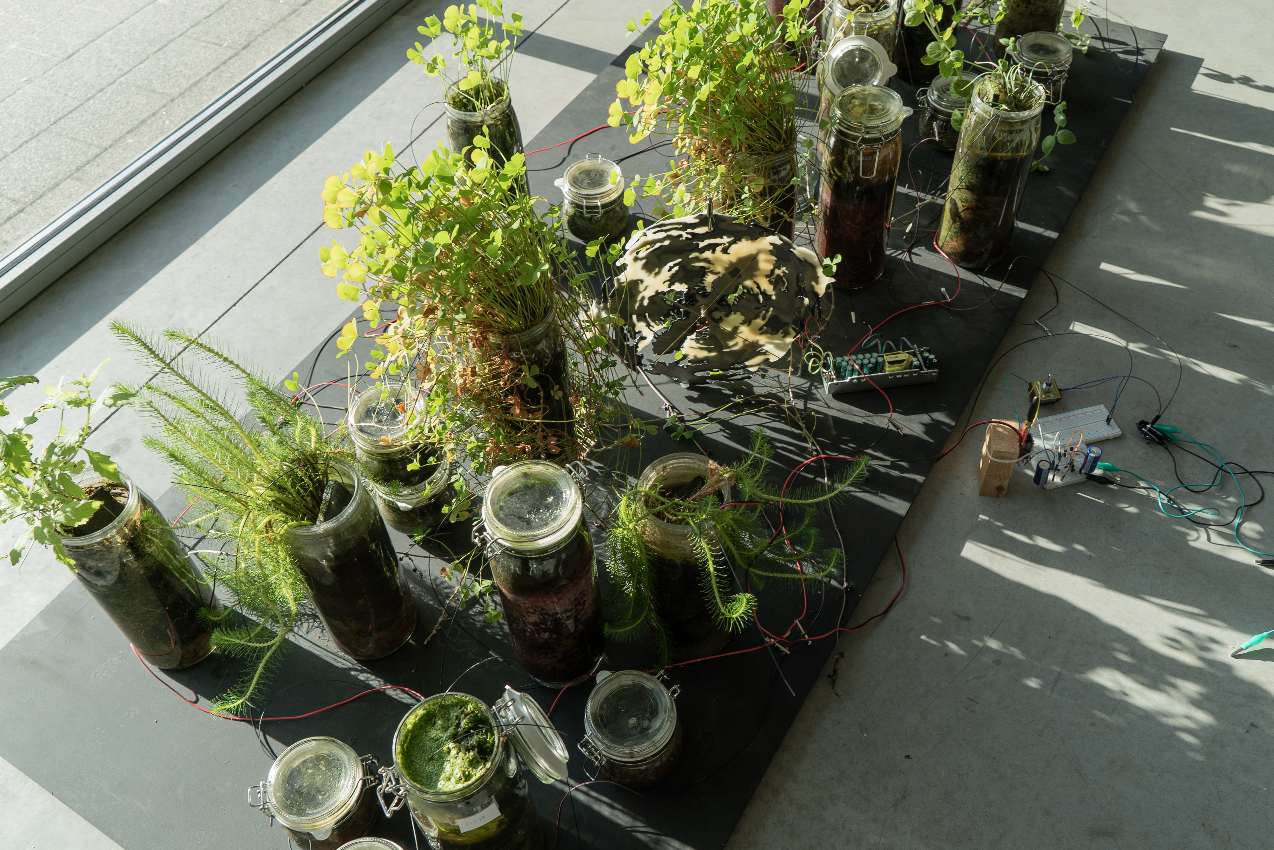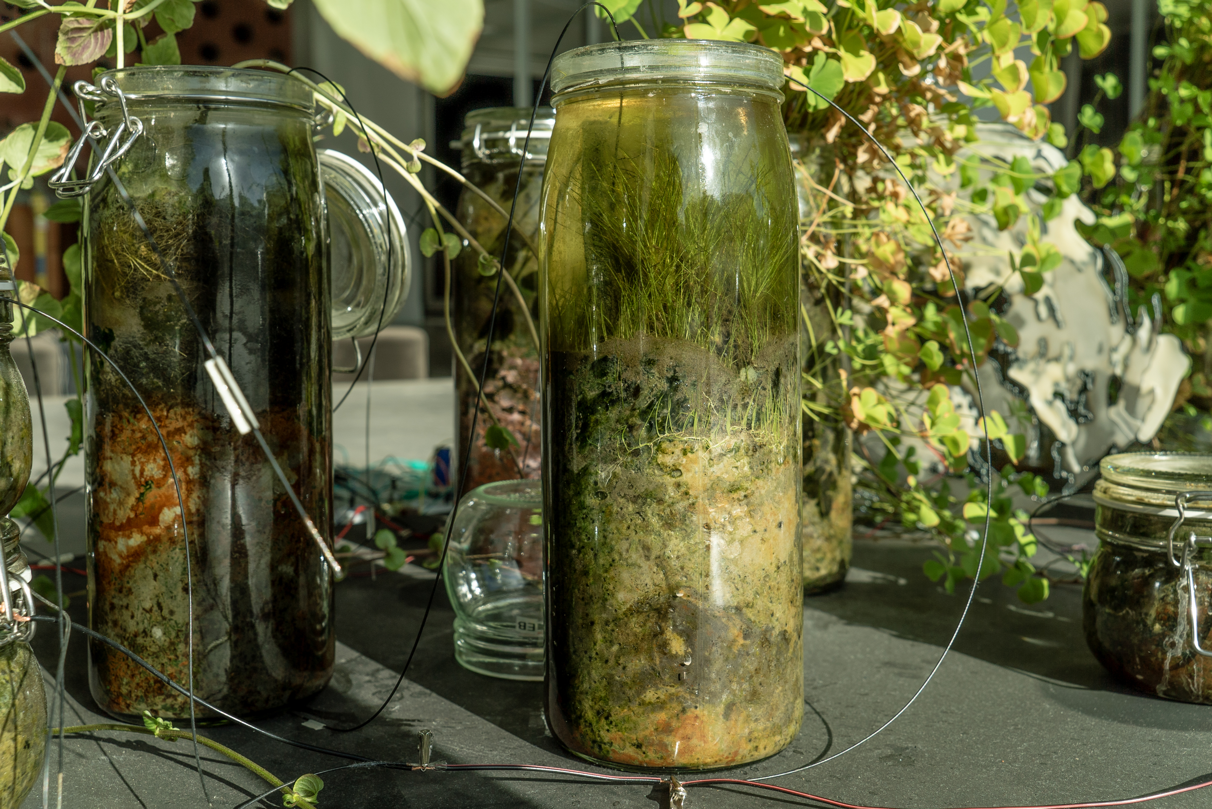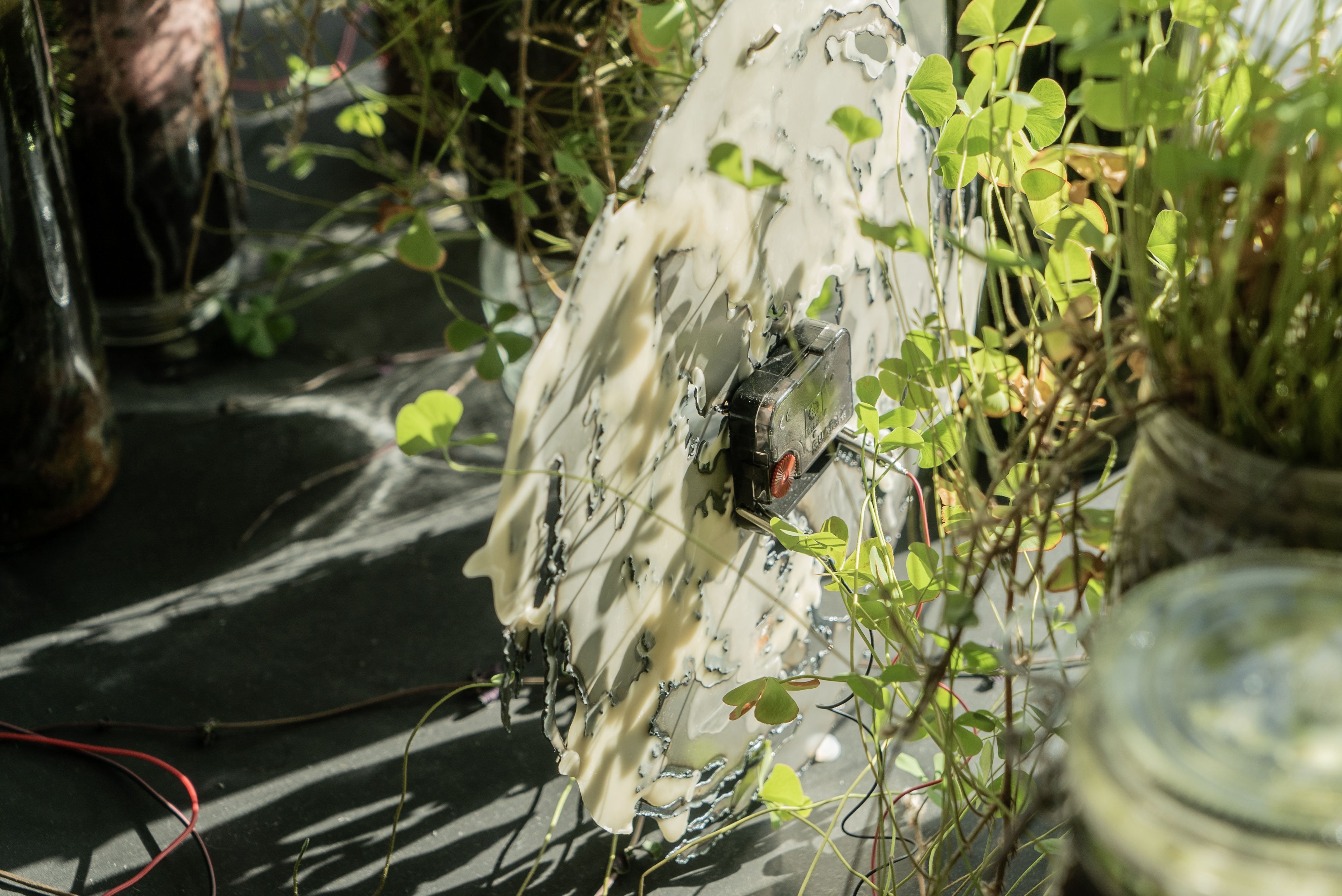 The artist investigates networks where the rhythms of human and non-human entities intertwine, focusing on the concepts of temporality, conductivity, decay, and care. She reinterprets conventional technologies, often viewed as energy consumers, as entities requiring care. By incorporating the environmentally sensitive characteristics of bacteria—reacting to changes in weather, temperature, humidity, and soil nutrients—into the energy generation process, the work embraces natural uncertainties instead of technological perfection, exploring the potential of cyclical electronic systems.
